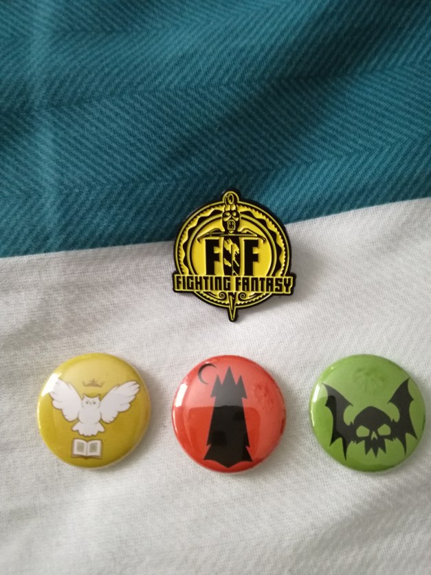 Before we crack on with the book itself, we shall look at the extras that came with the pledge I chose. To begin with, the four badges. Three of which contain logos which are neither intricate or large. They are rendered nicely enough but clearly badge 4, the Fighting Fantasy logo pin is the best amongst them.