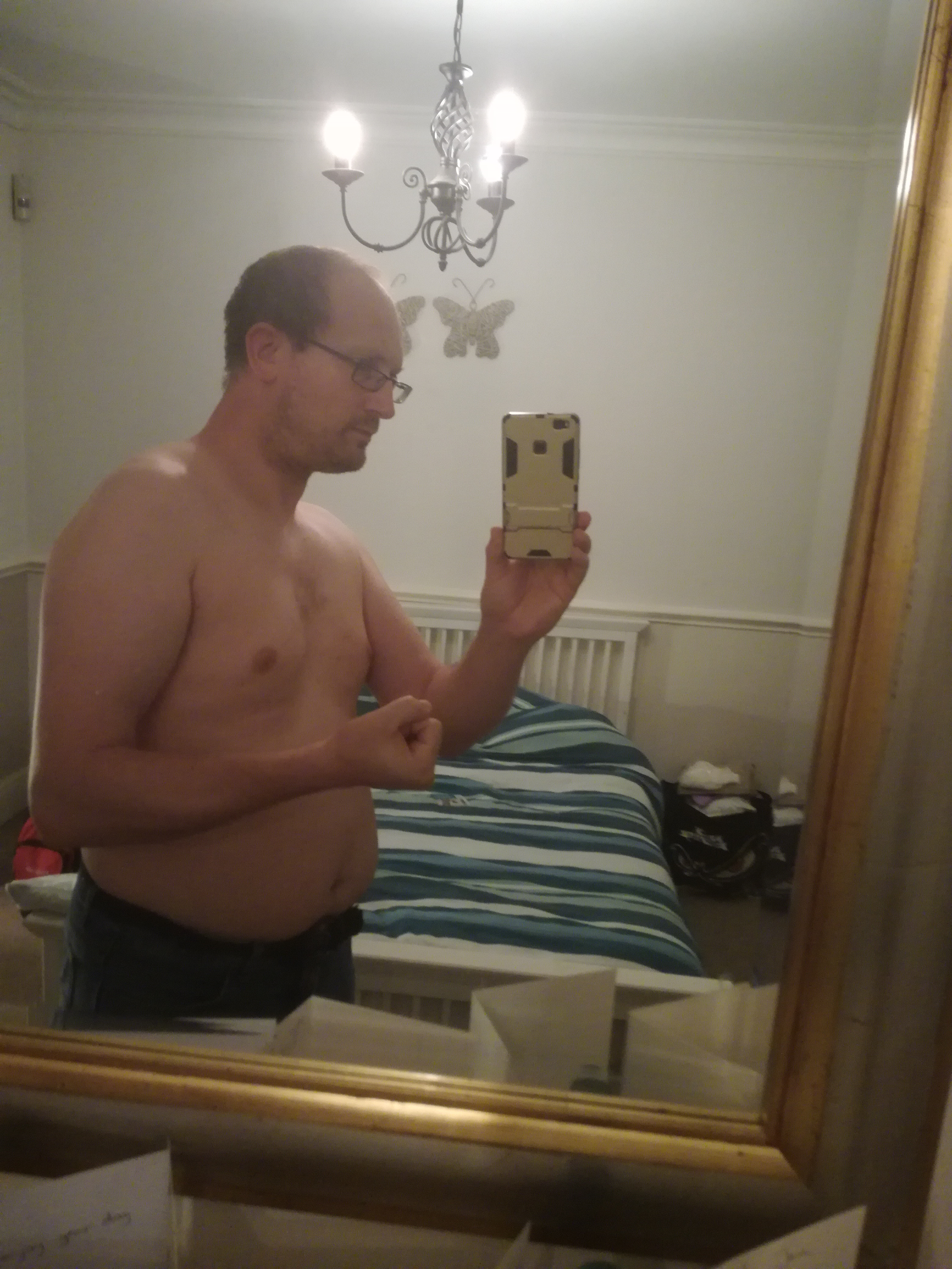 I have just completed day three of training. God I ache all over, but not as much as Day one which left me with a cramp in my left thigh. To be fair I do feel a little more flexible around my joint despite the pain. Tomorrow is the first rest day (as is every fourth day) and I have achieved two awards on the app. Once the pain has subsided I will consider starting the running app as well. On day thirty I shall post another pic of me on here and see if there are any differences before going in to Intermediate level. In the meantime here’s another reminder of how flacid things have become. Sorry! And watch this space.