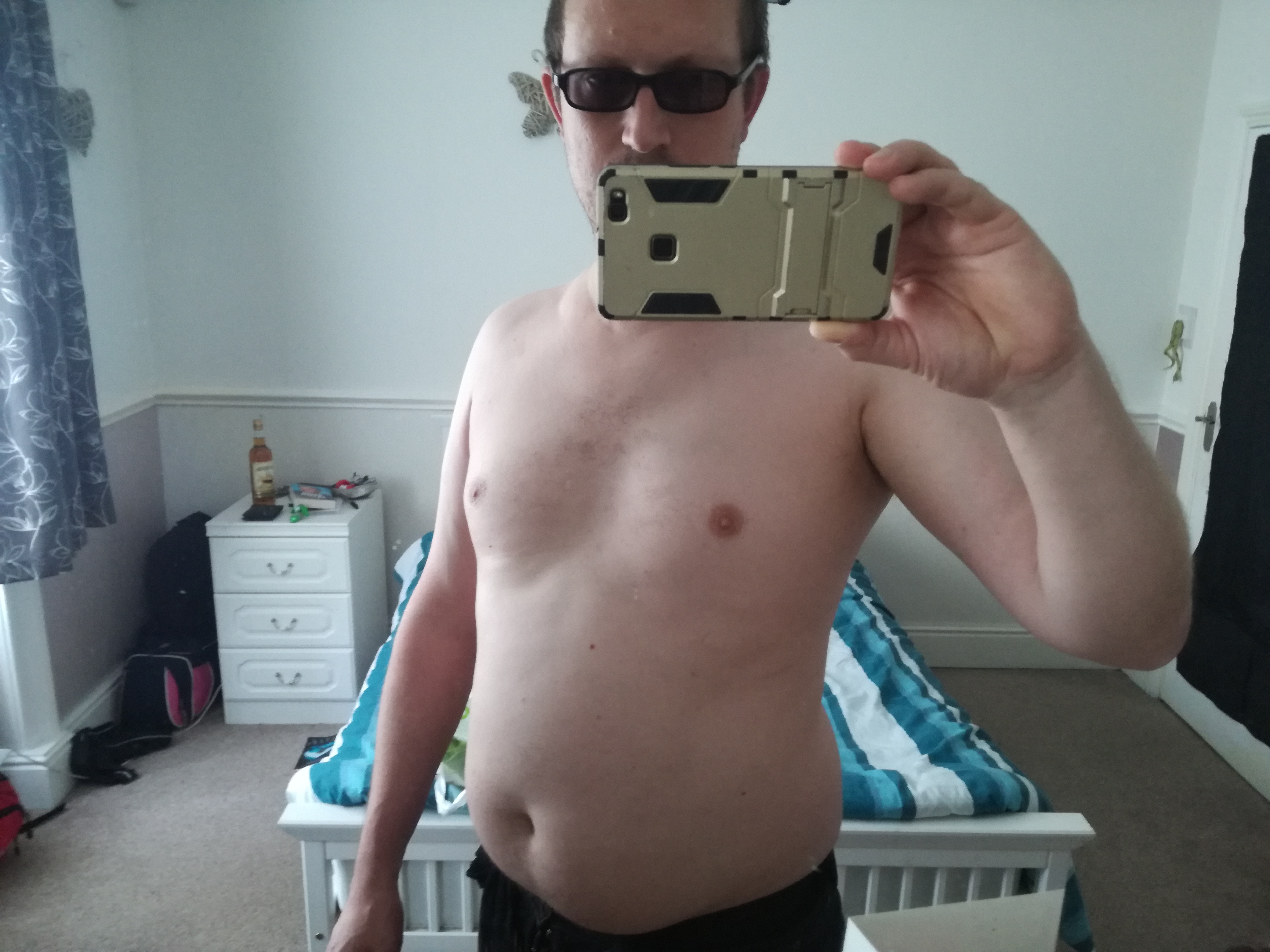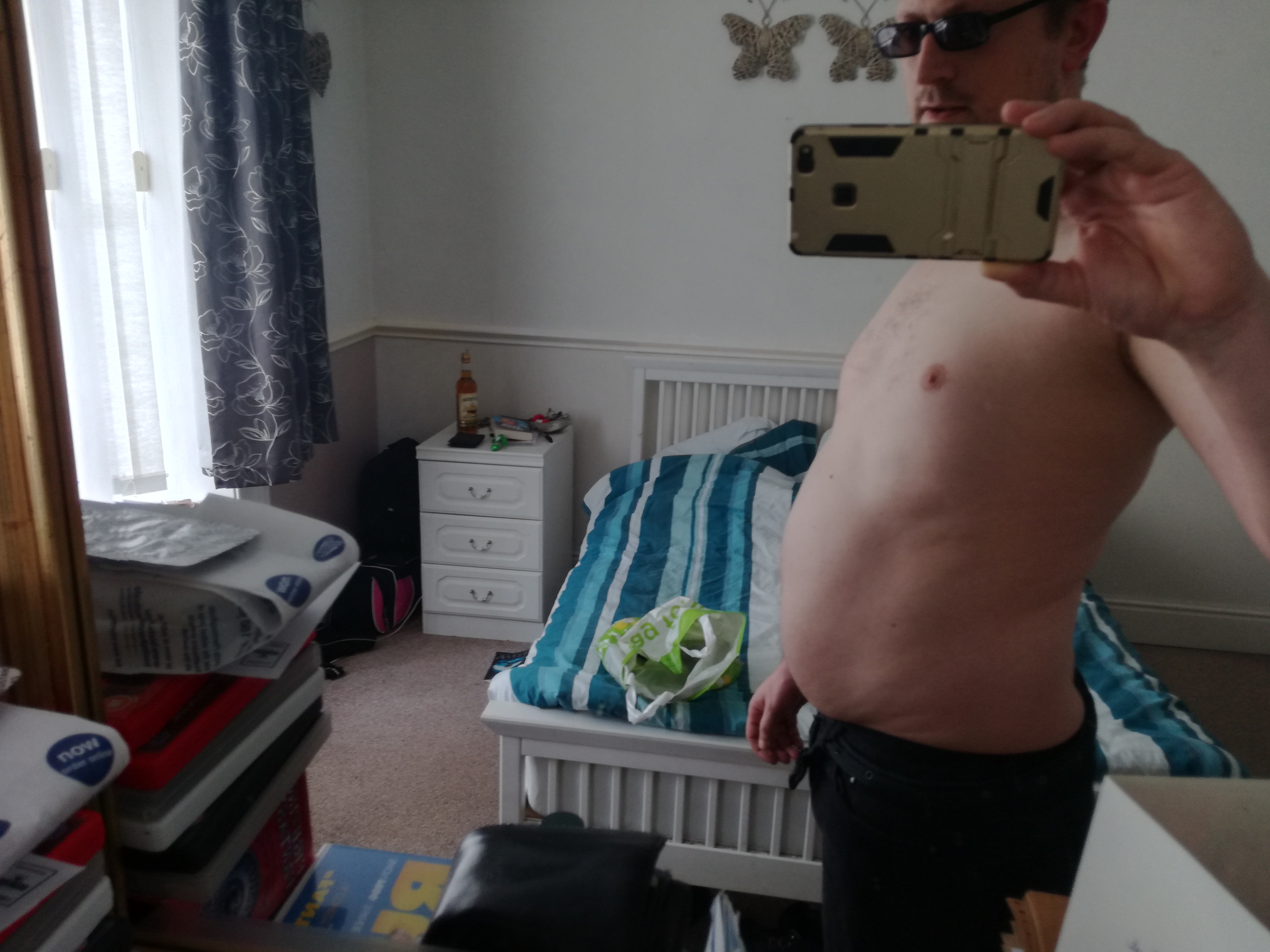 I have just completed day three of training. God I ache all over, but not as much as Day one which left me with a cramp in my left thigh. To be fair I do feel a little more flexible around my joint despite the pain. Tomorrow is the first rest day (as is every fourth day) and I have achieved two awards on the app. Once the pain has subsided I will consider starting the running app as well. On day thirty I shall post another pic of me on here and see if there are any differences before going in to Intermediate level. In the meantime here’s another reminder of how flacid things have become. Sorry! And watch this space.