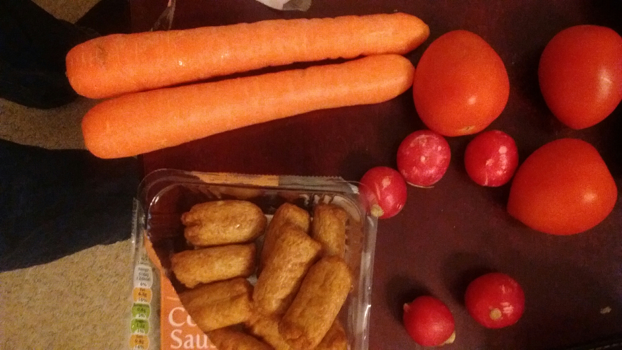 I ate in that order too, after the second tomato I already felt quite full. Though each one doesn’t even contain 20 calories, they are packed with anti oxidants. The carrots contain a couple of good nutrients of course, and the radishes, despite tasting like a mouthful of table pepper. The Quorn sausages were very high in protein but also almost equally high in fat. About 12g of both per 100g. Just 4 sausages contained 124 calories. These would probably be made by grinding up mushrooms and biscuits in a post Zombie Apocalypse world.